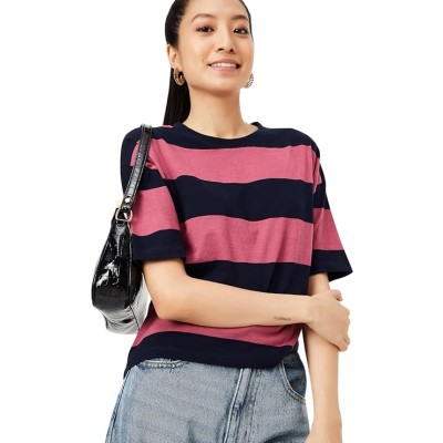 Women's Cotton Regular Fit Striped Drop Shoulder T-Shirt