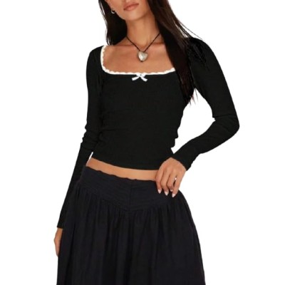 Solid Square Neck Long Sleeve Lace & Bow Detailed Stylish Y2k Ribbed Top for Women