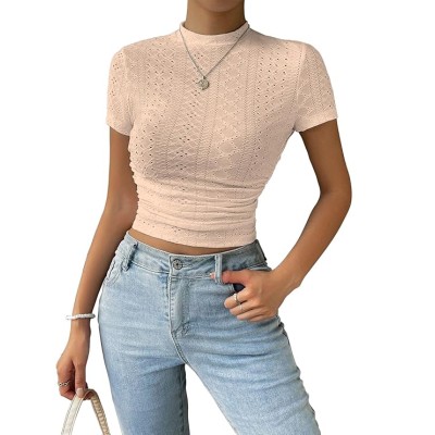 Women's Green Casual Semitransparent Cropped High-Neck Lace Trim Ladies T-Shirt