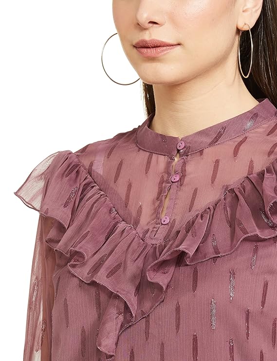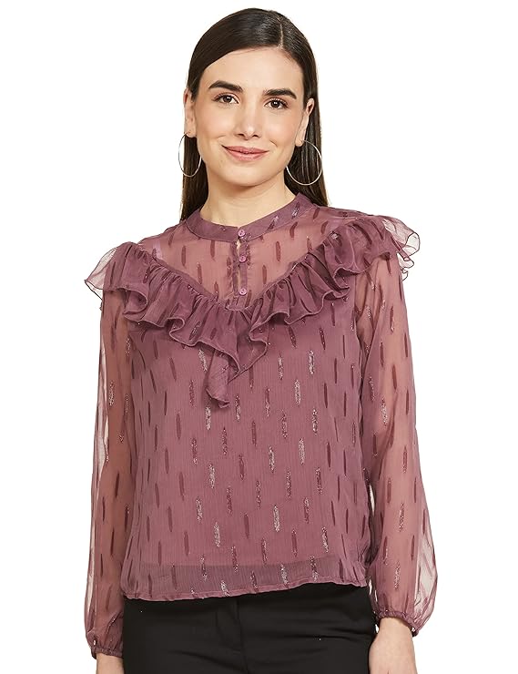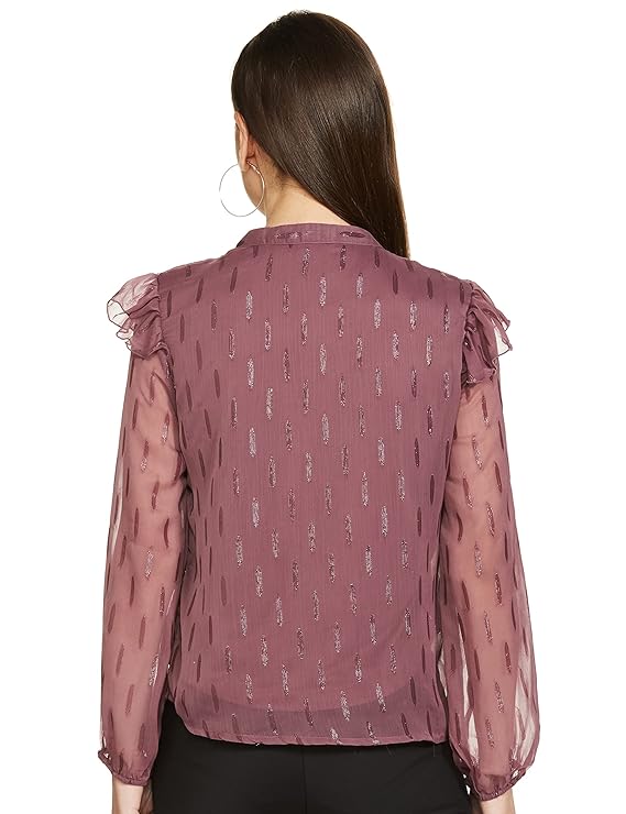 Women Polyester Textured Full Sleeves Ruffled Casual Regular Fit Top