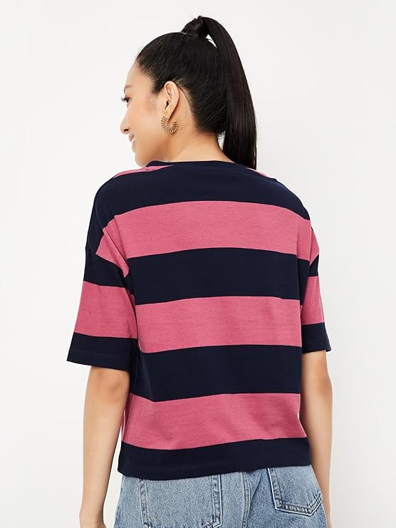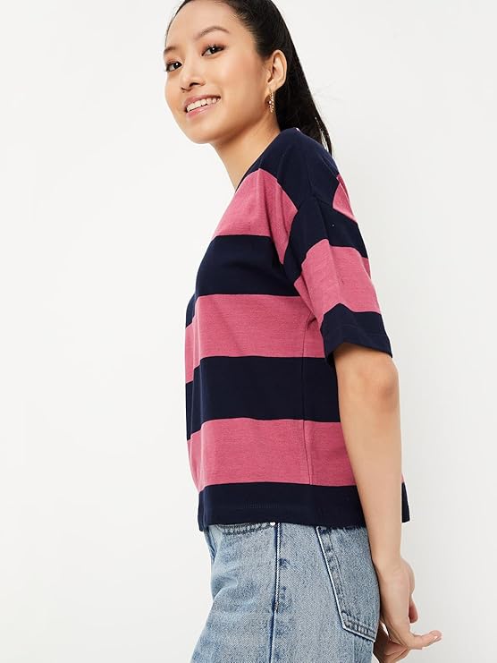 Women's Cotton Regular Fit Striped Drop Shoulder T-Shirt